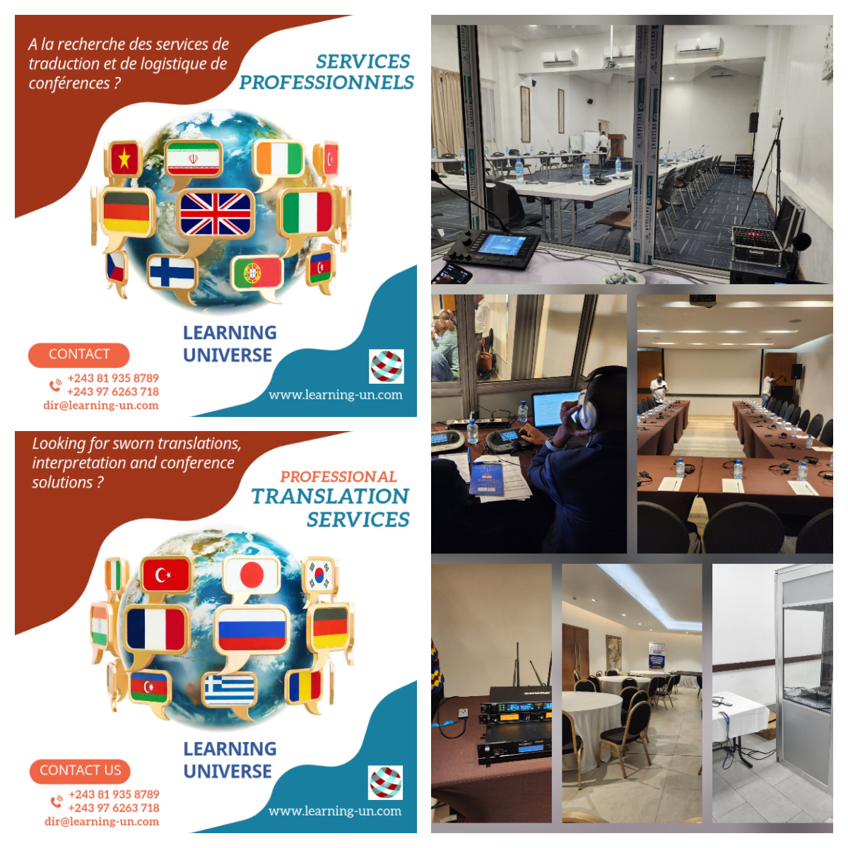 Pour vos activités, conférences, réunions, sommets, prédication, ... couvrant les langues suivantes : Anglais, Français, Lingala, Portugais, Espagnole, Arabe, Chinois...